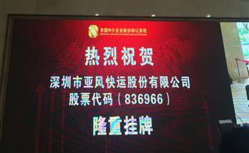 2016年7月11日,深圳市亚风快运股份有限公司(以下简称:亚风快运 股票代码:836966)挂牌敲钟仪式在北京金融街全国股份转让系统公司(北京市西城区金融大街26号金阳大厦)隆重举行。深圳市亚风快运股份有限公司董事长梅杰先生、亚风快运总经理林本...